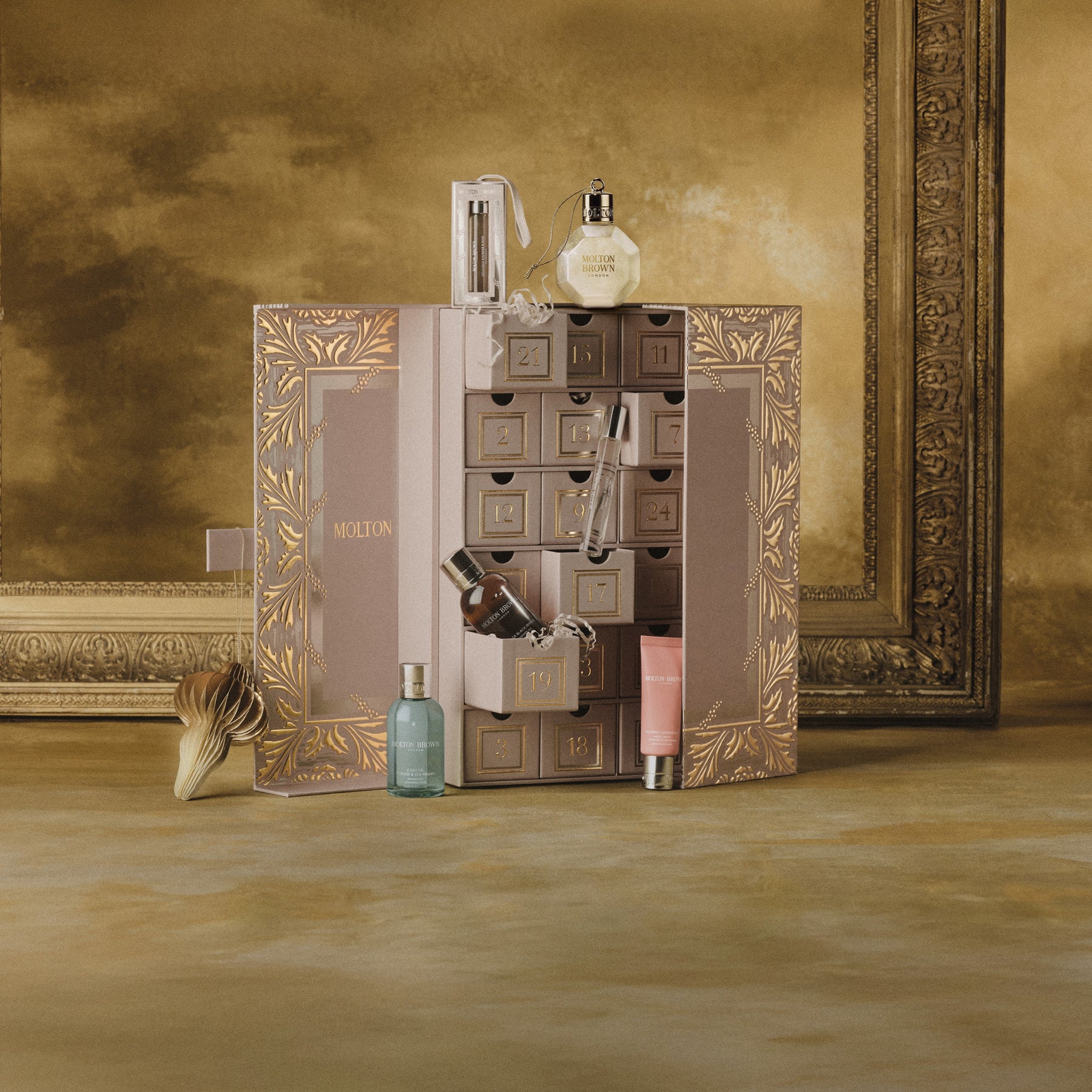 年に一度だけ登場する、モルトンブラウンの特別なコフレ「アドベントカレンダー」。煌めく額縁を思わせる限定ボックスの中には、人気のボディケア、ヘアケア、フレグランスなど全24品を豪華に詰め合わせました。引き出しをひとつずつ開けるたびに、香りとともに心が華やぐホリデーシーズンを演出します。